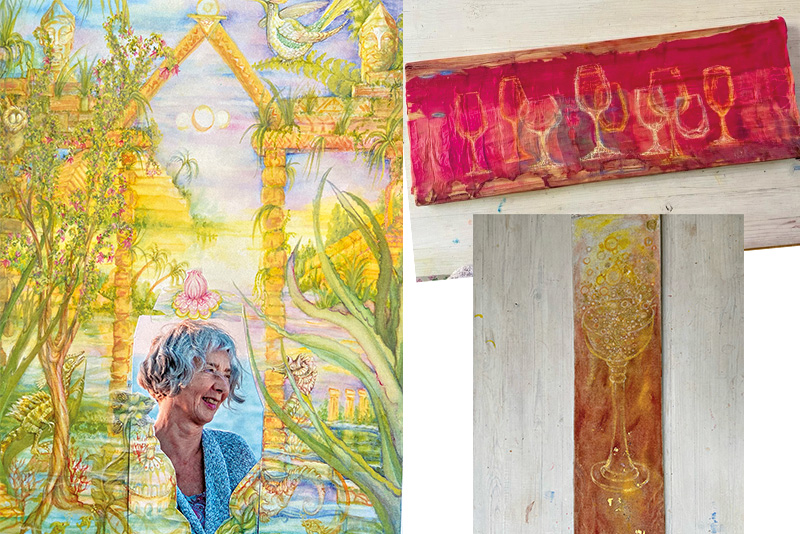 Die neueren Bilder zeigen Assoziationen zum Thema Wein. Ältere Arbeiten sind in einem Kartenset zusammengefasst (als Teil eines Chakra-Brettspiels) – die Originale sowie das Spielset werden hier gezeigt.