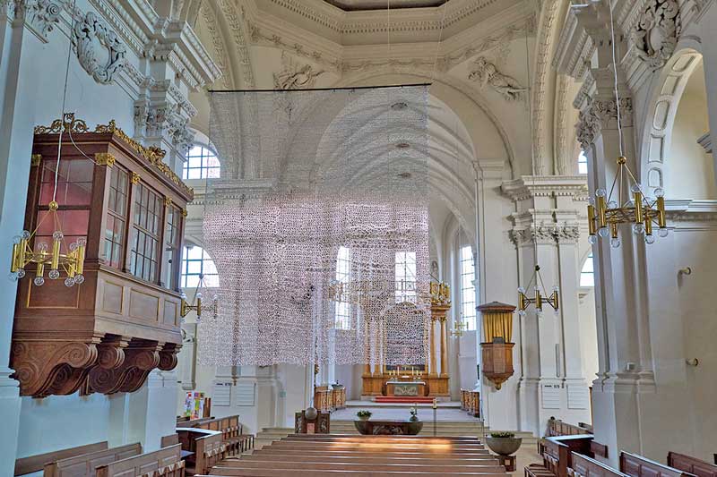 „Gimme Shelter“ ist seit 2022 in St. Stephan zu sehen und soll mit diesem Abend noch einmal in seiner Weite vorgestellt und ausgelotet werden. Die vielfältigen, oft atmosphärischen Bezüge, die das Werk zum umgebenden Raum herstellt, spielen mit Themen wie Licht oder Sichtbarkeit und rufen Gedanken an Schutz und Zerbrechlichkeit, an Transparenz, Metaphysik und Religion hervor.