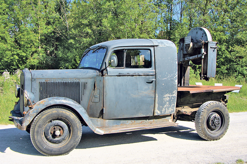 Der Opel Blitz lief vermutlich in den späteren 1930er Jahren vom Band. Die Blitz-Laster kamen für Sach- und Personentransporte, als Feuerwehr- und Krankenwagen und beim Militär zum Einsatz. Und in diesem Spezialfall gar als mobile Säge!