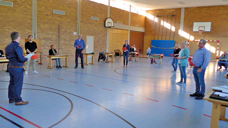 Walsdorf (rr). Es war schon ein etwas ungewohntes Bild, als der neu gewählte Walsdorfer Gemeinderat zu seiner konstituierenden Sitzung in der Schulturnhalle zusammenkam. Bisher fand die Sitzung des Gemeinderates im Versammlungsraum im Feuerwehrhaus in Walsdorf statt, wo die Gemeinderäte – zusammen mit dem 1. Bürgermeister und dem Geschäftsführer – an einer großen Tischreihe saßen. Der neu gewählte 1. Bürgermeister Mario Wolff (Freie Liste) wurde nach der Eröffnung der Sitzung zunächst von Gemeinderat Andreas Feulner (CSU) vereidigt, bevor Wolff den sechs neu gewählten Gemeinderäten den Eid abnahm.
