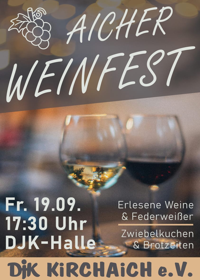 Die DJK Kirchaich lädt am 19. 9. 25, ab 17:30 Uhr, zum Aicher Weinfest in der DJK-Halle ein.