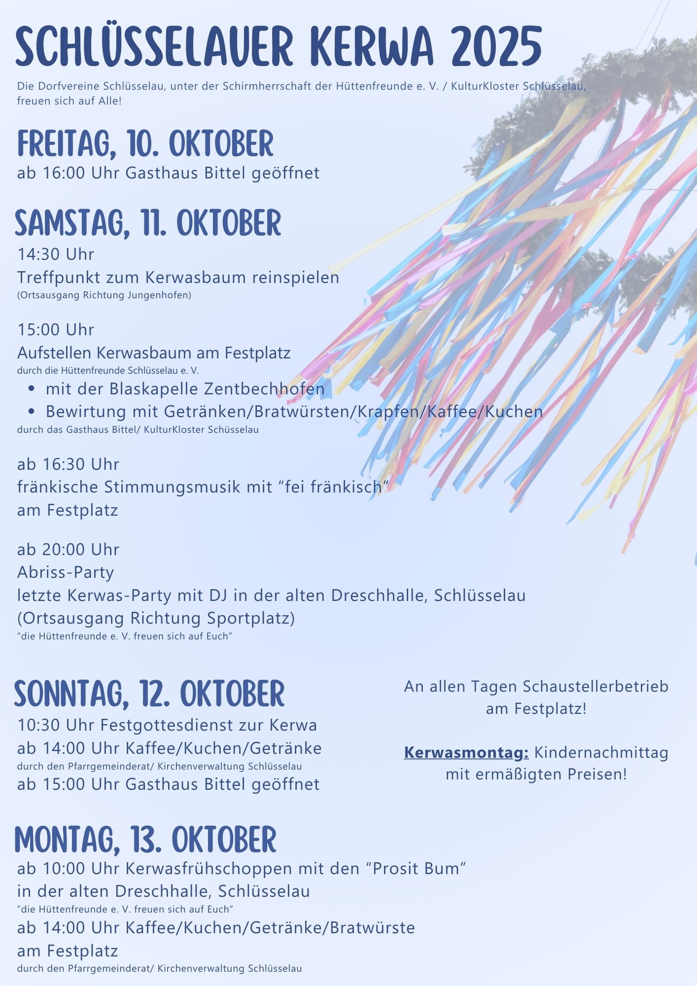 Die Dorfgemeinschaft Schlüsselau lädt vom 10. 10. 25 - 13. 10. 25 zur Kirchweih ein.