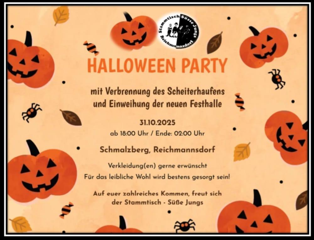 Der Stammtisch „Suesse Jungs“ Reichmannsdorf lädt am 31. 10. 25 zur diesjährigen Halloween-Party mit großem Feuer und Einweihung der neuen Festhalle auf den traditionellen Schmalzberg in Reichmannsdorf ein. Verkleidung(en) sind gerne gesehen. Beginn: 18:00 Uhr. Ende: gegen 2:00 Uhr (aufgrund des Feiertags Allerheiligen). Für das leibliche Wohl wird bestens gesorgt sein!
