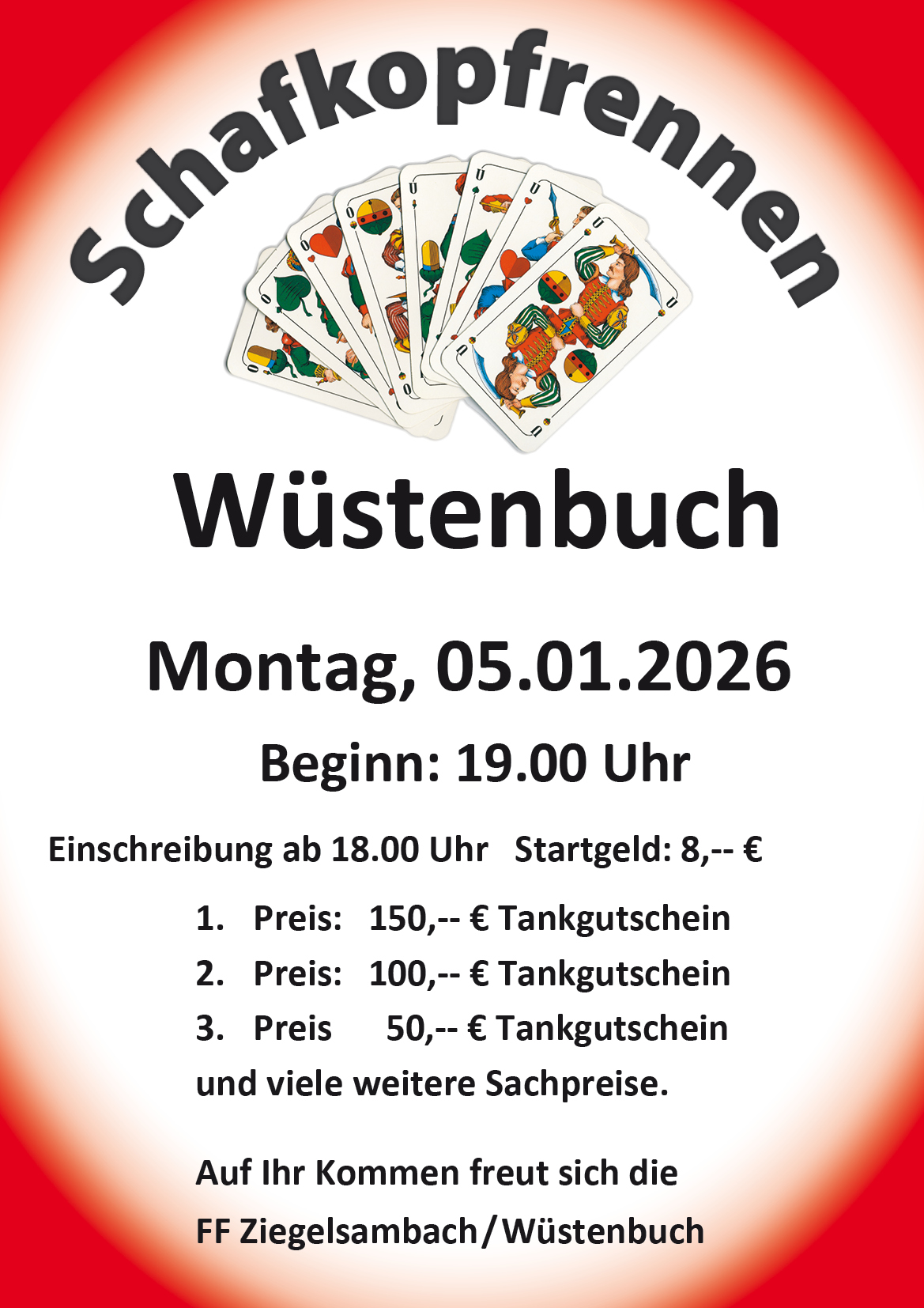 Die FF Ziegelsambach/Wüstenbuch lädt am 5. 1. 26 alle Kartfreunde zum traditionellen Schafkopfrennen nach Wüstenbuch ein. Einschreibung: ab 18:00 Uhr. Beginn: 19:00 Uhr. Startgeld: 8 Euro.