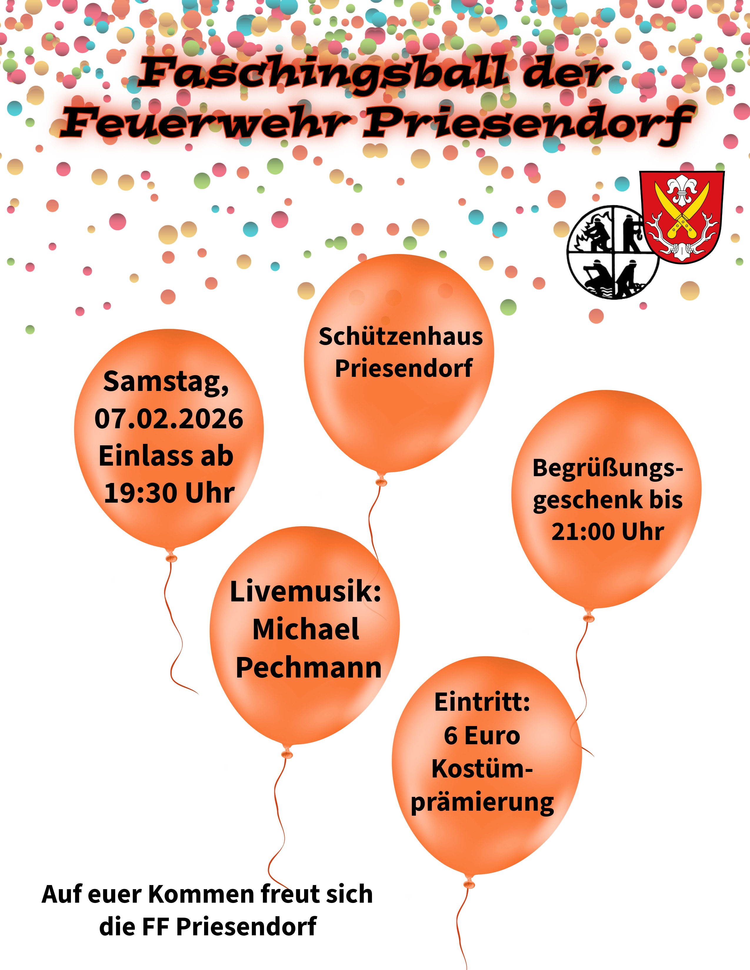Die Feuerwehr Priesendorf lädt am 7. 2. 26 zum Faschingsball im Schützenhaus Priesendorf ein. Beginn: 19:30 Uhr.