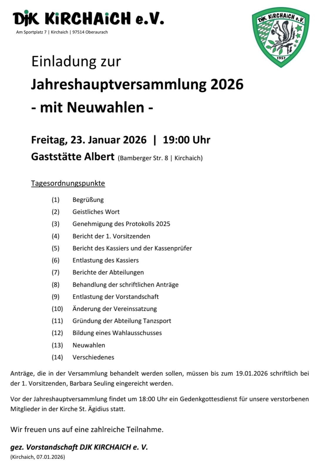 Die Jahreshauptversammlung der DJK Kirchaich findet am 23. 1. 26 um 19:00 Uhr in der Gaststätte Albert (Bamberger Str. 8) statt.