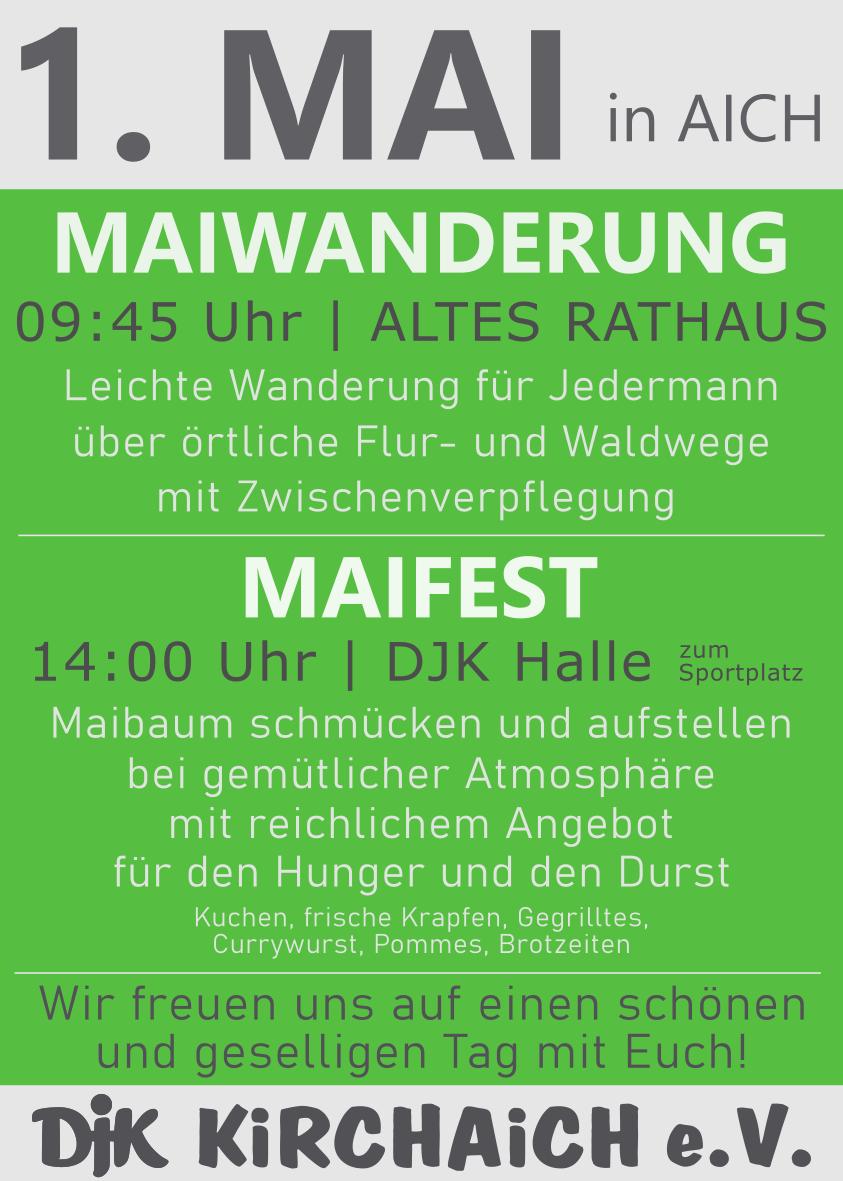 Ab 14:00 Uhr Maifest an der DJK-Halle mit Maibaum-Aufstellen. Für das leibliche Wohl ist bestens gesorgt.