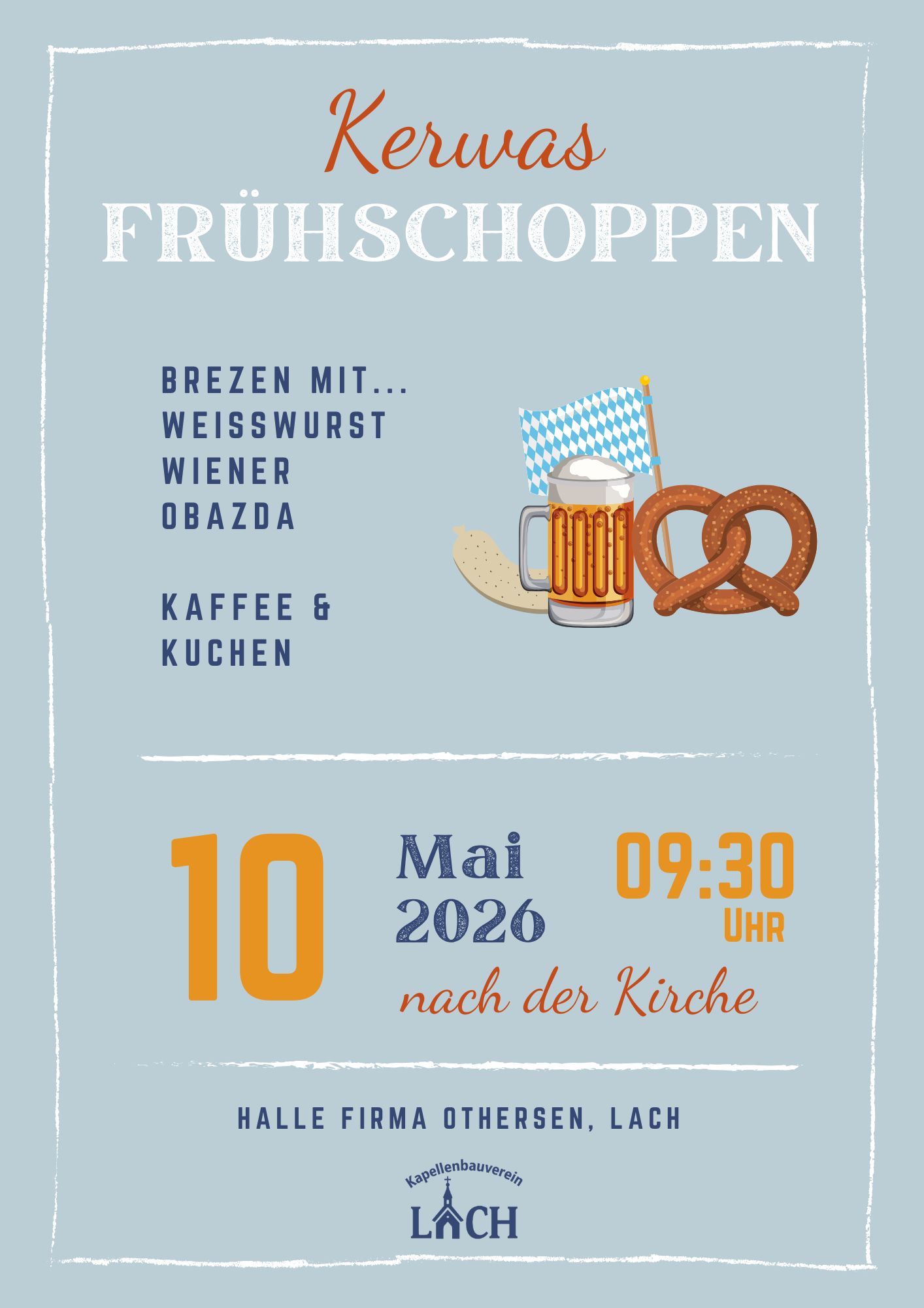 Der Kapellenbauverein Lach lädt am 10. 5. 26 zum Kerwas-Frühschoppen an der Othersen-Halle ein. Beginn: 9:30 Uhr nach dem Gottesdienst.