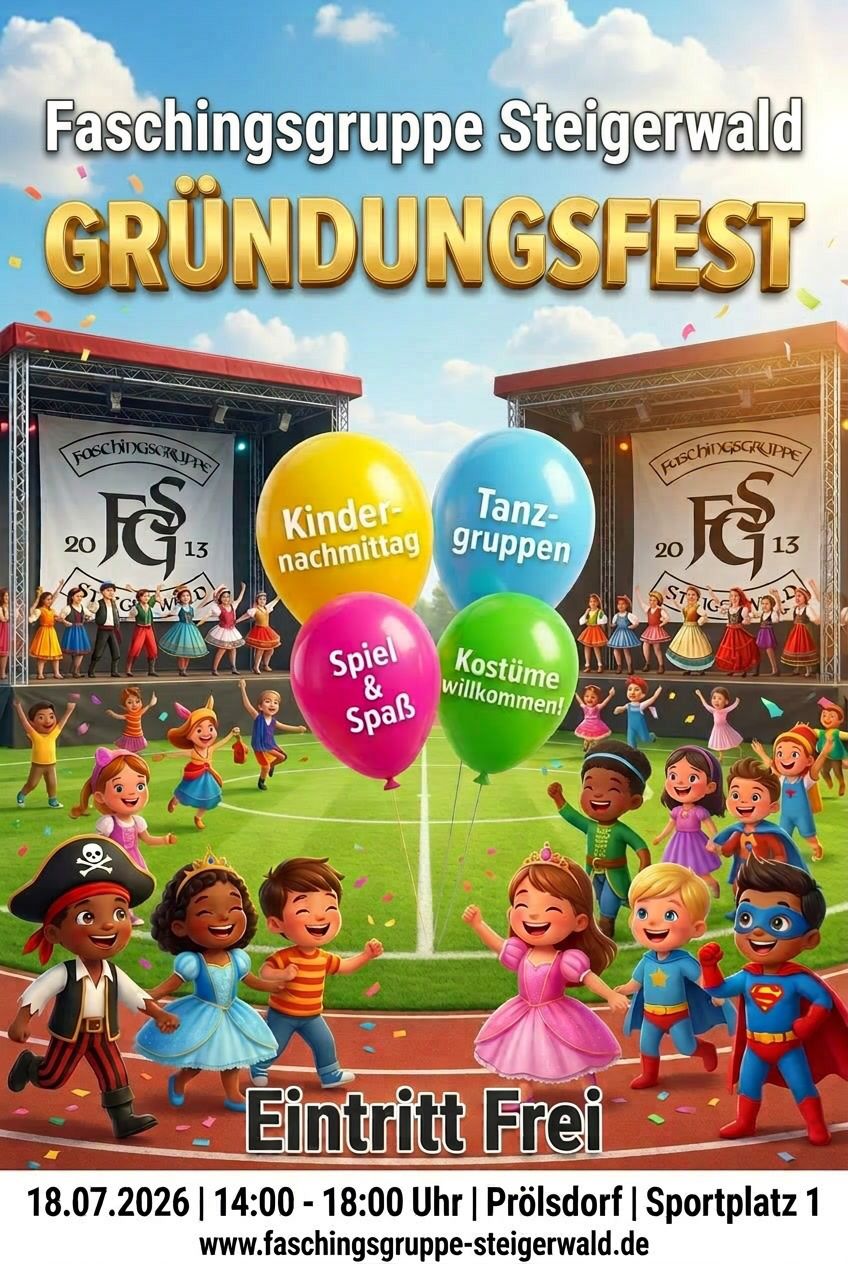 Das Gründungsfest des Vereins „Faschingsgruppe Steigerwald“ startet am 18. 7. 26, ab 14:00 Uhr, mit einem Familiennachmittag mit verschiedenen Attraktionen und Kinderprogramm (Kostüme willkommen) in Prölsdorf am Sportplatz.